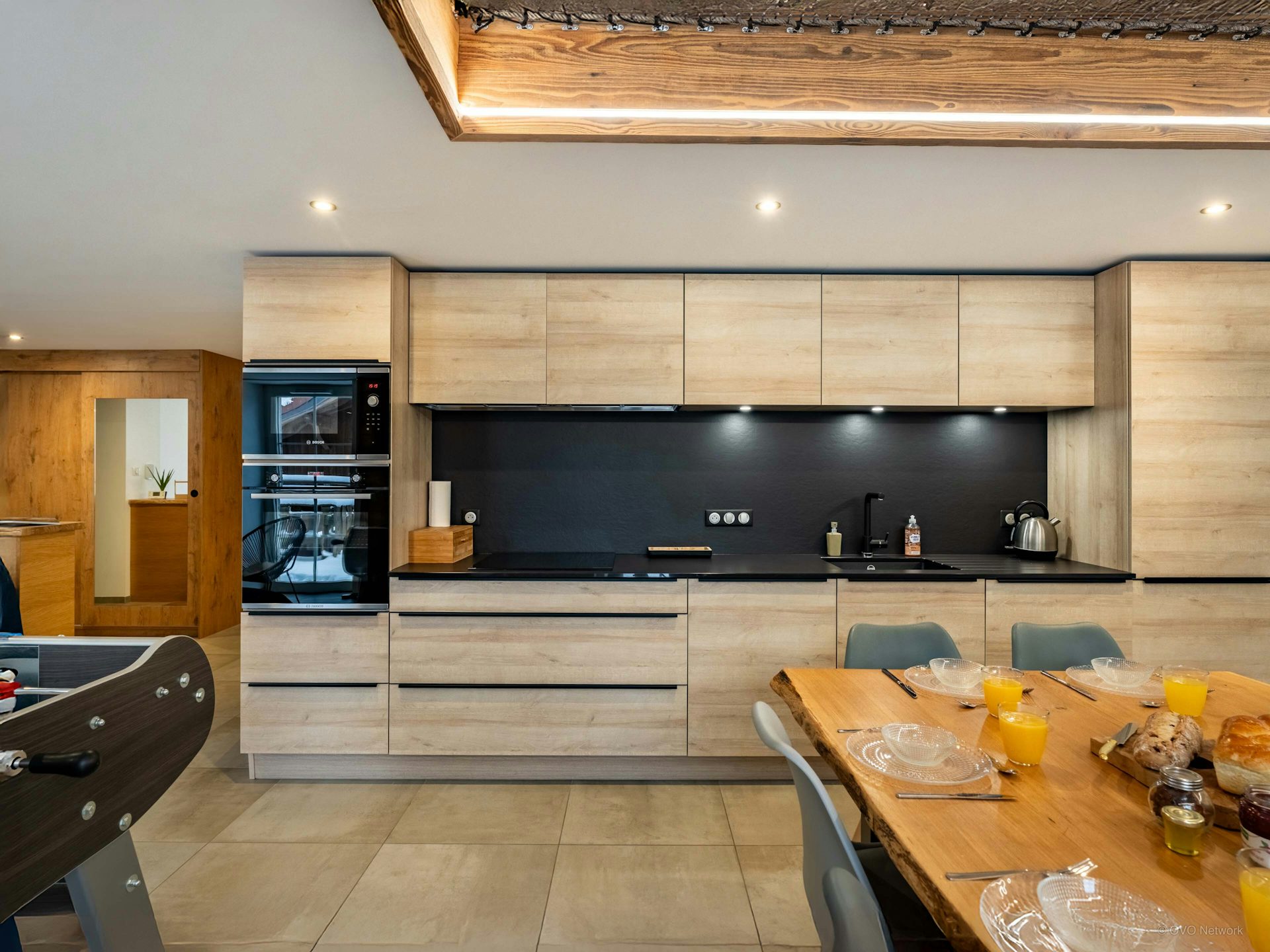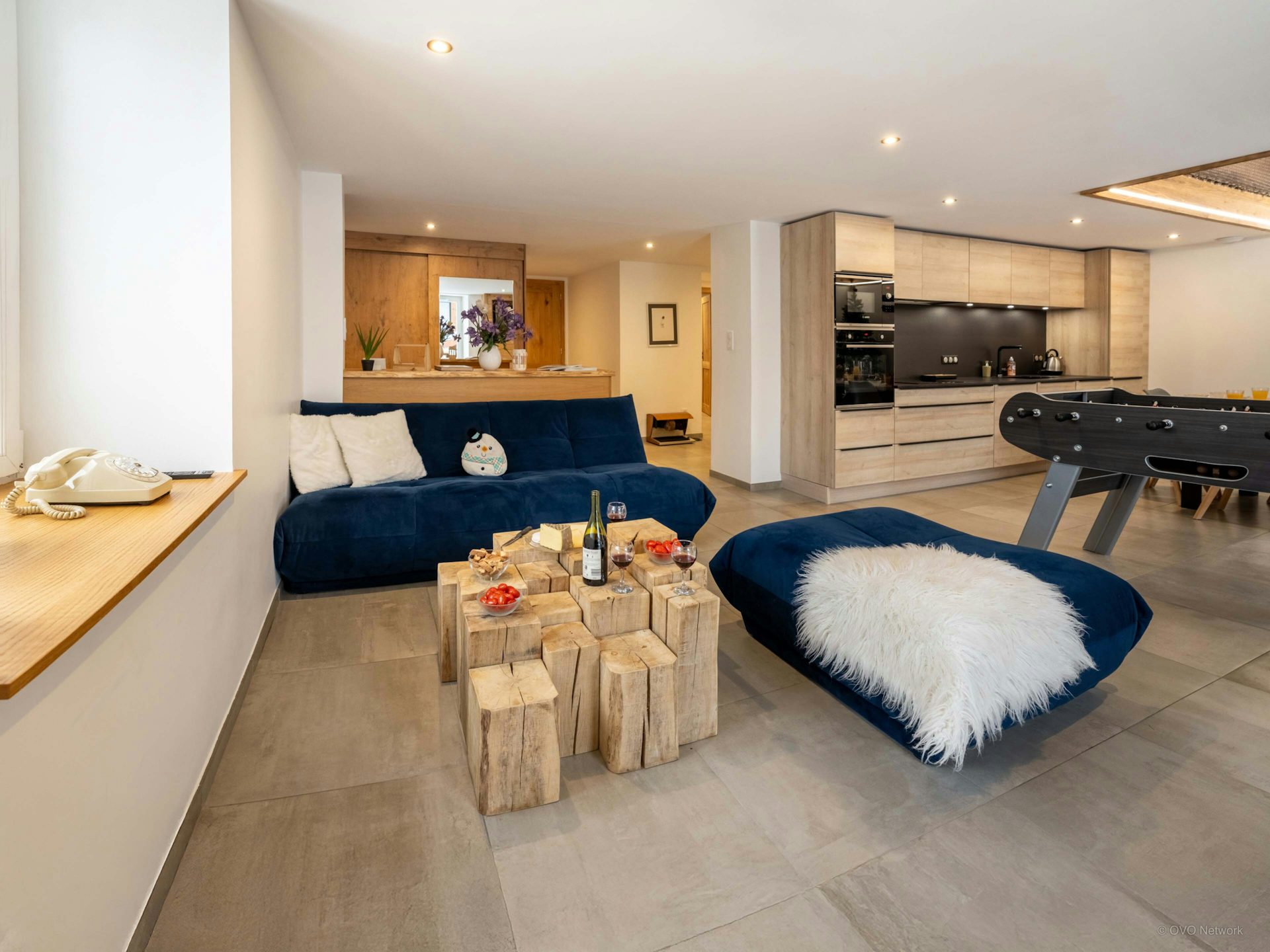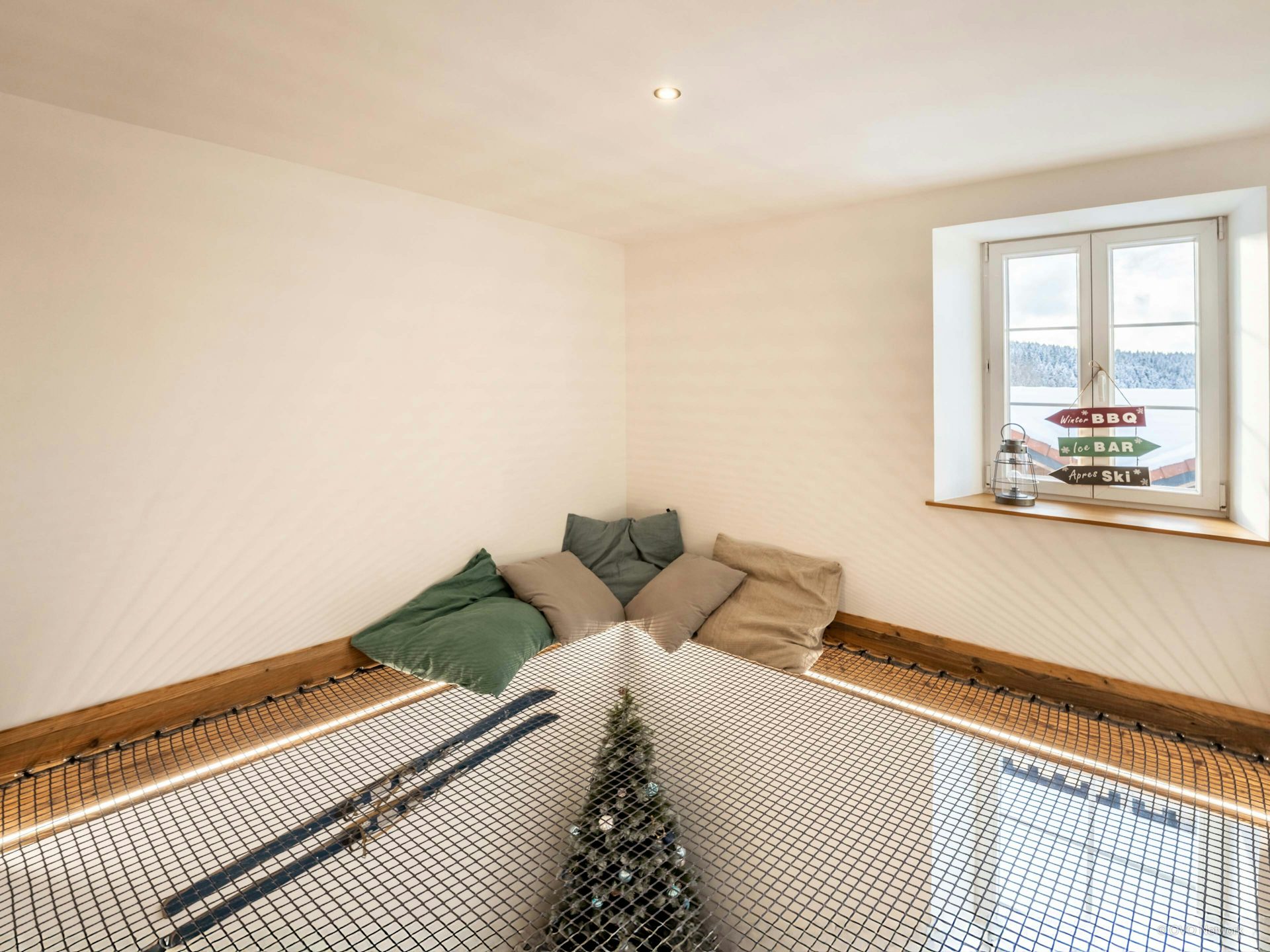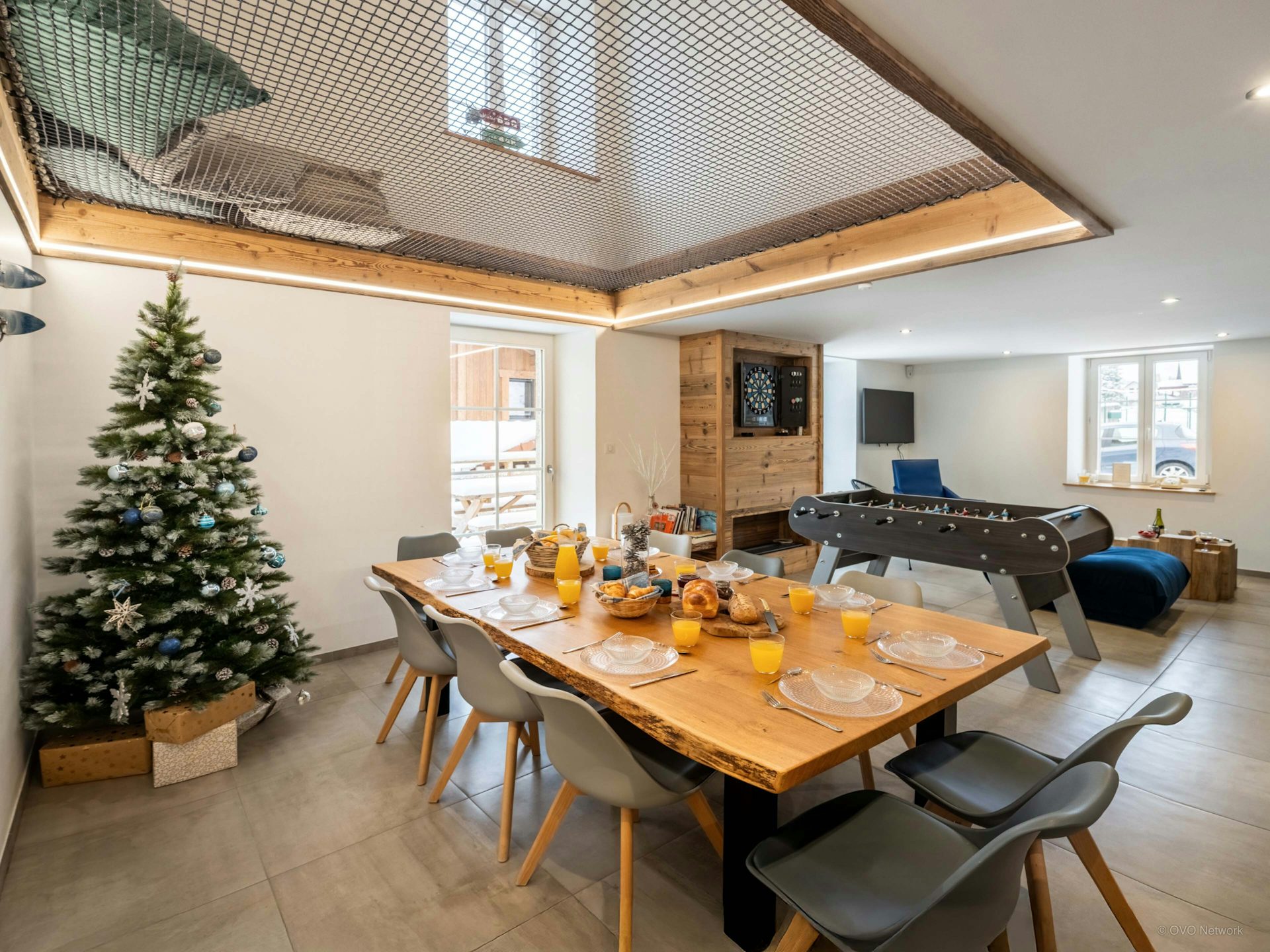 The living area is naturally the heart of the chalet. Get cosy around the fire or enjoy a game of table football or darts. Just above, children can have fun in the playroom, which has a net floor, while staying within earshot.