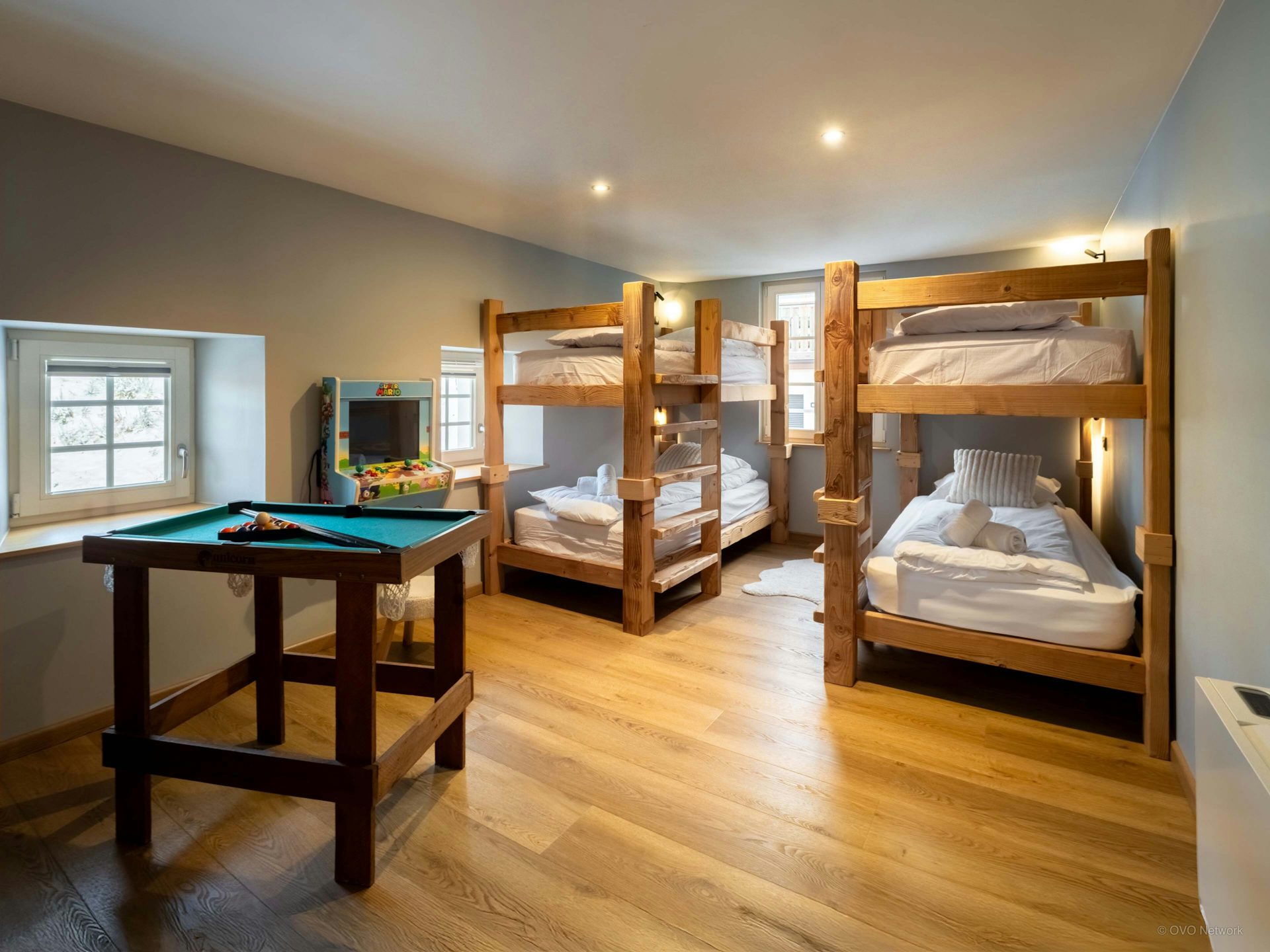 The chalet has four bedrooms, three of which have their own bath or shower rooms. Children and teenagers will love the bunk room for four, which has a games machine and a mini pool table.